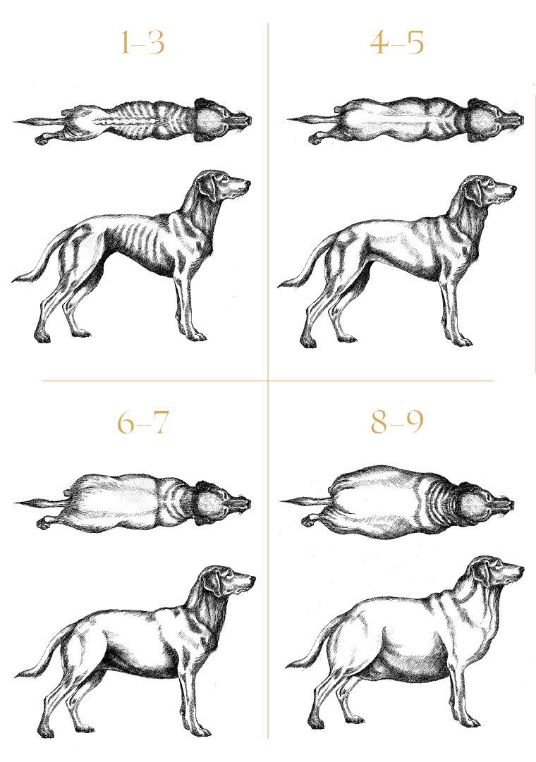 Body Condition Score (BCS) är en enkel skala från 1 till 9 som används av veterinärer för att beskriva hur mycket kroppsfett en hund har – med andra ord, hur nära de är sin hälsosammaste form.