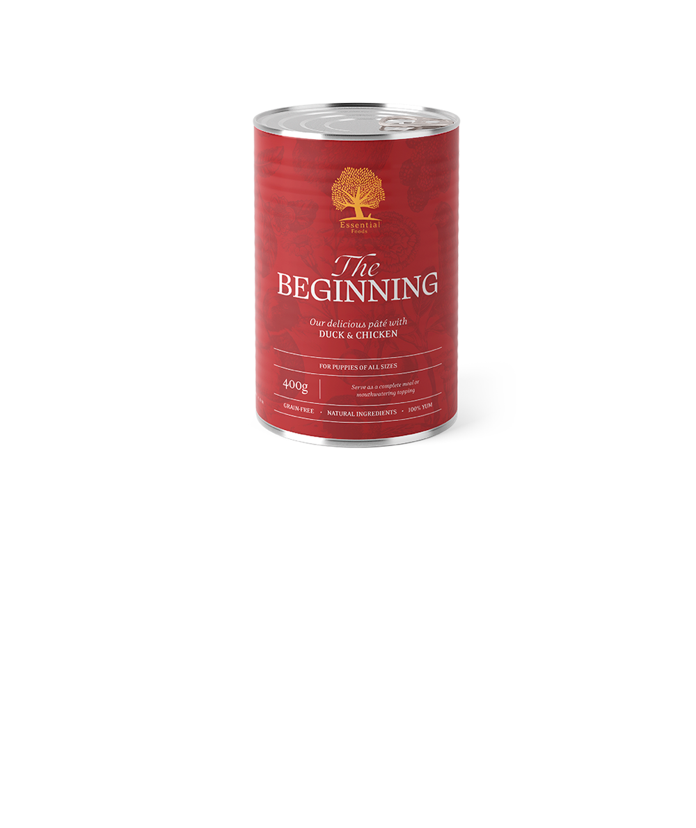 THE BEGINNING PÂTÉ är vår läckra paté med bitar av kött från anka och kyckling. Kan serveras som komplett måltid eller som himmelsk topping för valpar av alla raser och storlekar.