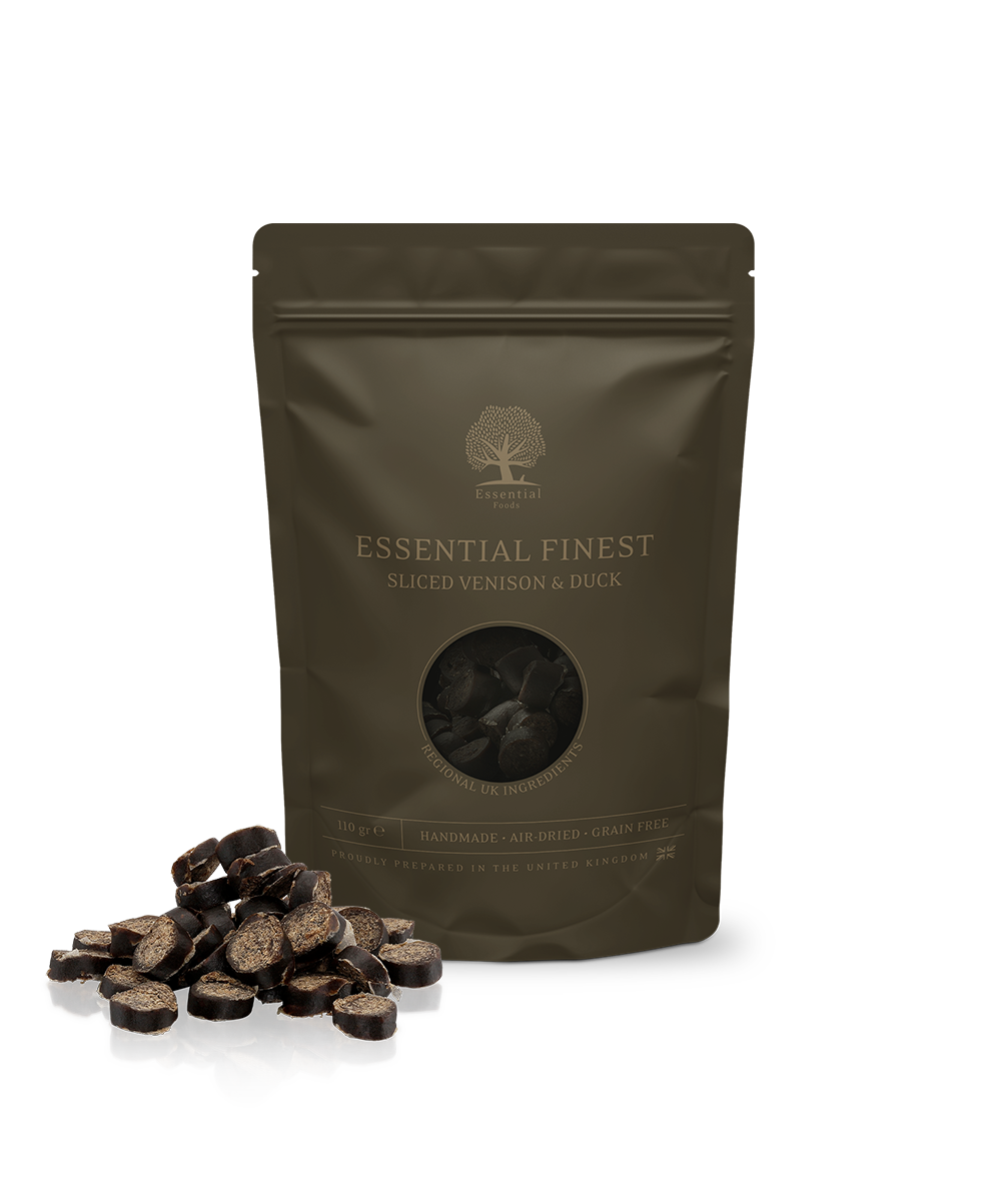 När bara det bästa är gott nog. ESSENTIALS FINEST är vår serie av riktigt lyxiga godbitar som matchar innehållet i våra måltider. Otroligt goda och kanske lite för mycket av det goda – men det är ju svårt att låta bli. Småsnacks i snittar tillagade med hjort och anka. Perfekt som lyxträningsbitar/belöningsgodbitar. Lufttorkat och handgjort från början till slut – i England.