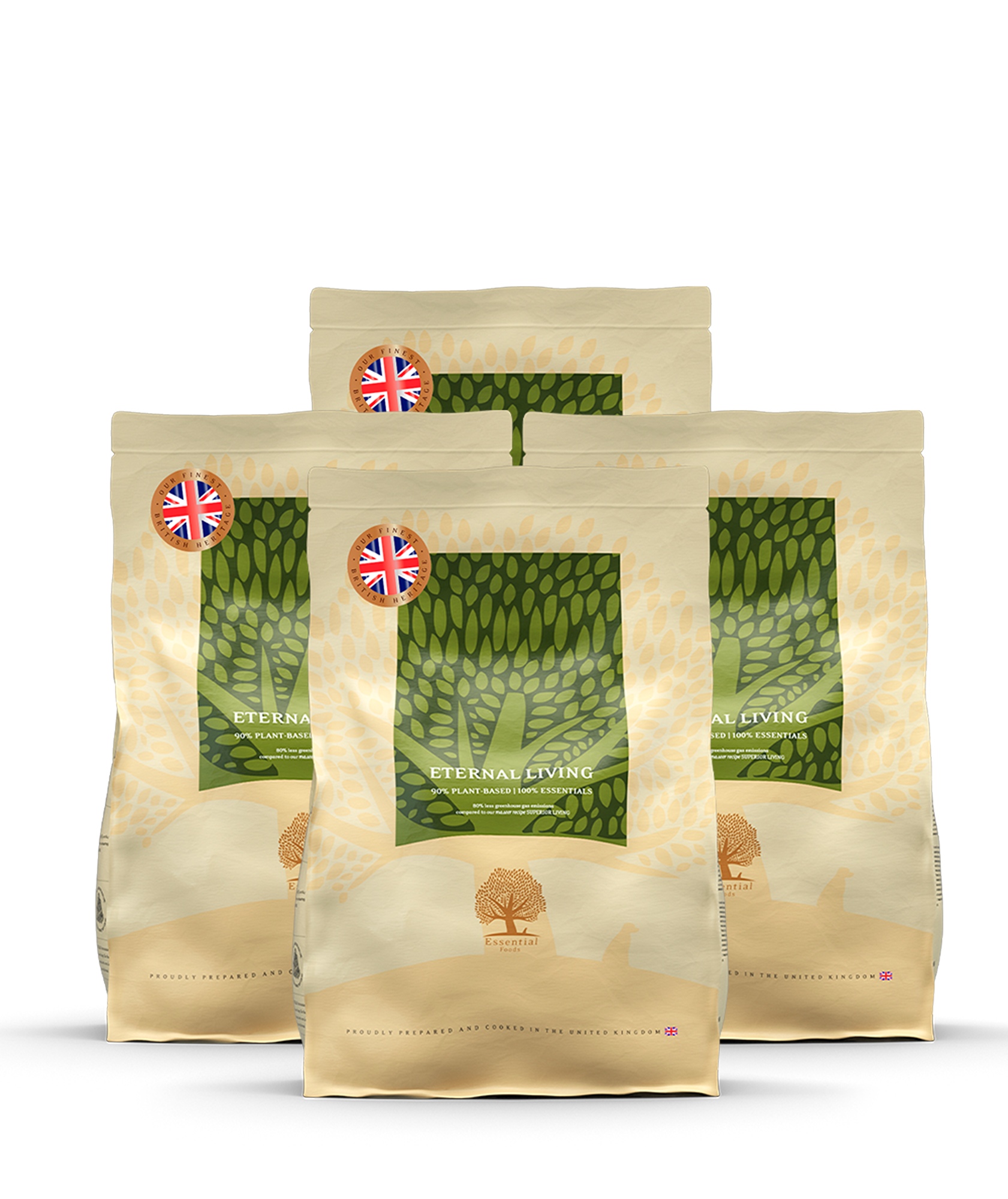 ESSENTIAL ETERNAL LIVING är vår allergivänliga och skonsamma måltid för hundar med känsliga magar eller allergier* De noga utvalda råvarorna syftar till en optimal matsmältning, kombinerat med en oemotståndlig smak. Även om ingredienserna skiljer sig från våra övriga kött- och fiskbaserade måltider så ger ETERNAL LIVING precis samma enastående fördelar som våra andra måltider, och alla näringsmässiga behov täcks – och lite mer än så. ETERNAL LIVING är spannmålsfri och ett perfekt val till även den mest kräsna hund.